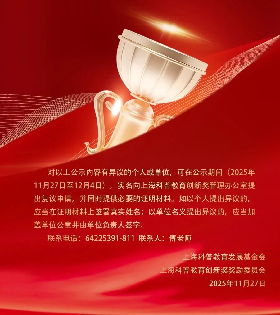 【赛复活动】2025年上海科普教育创新奖获奖前公示
