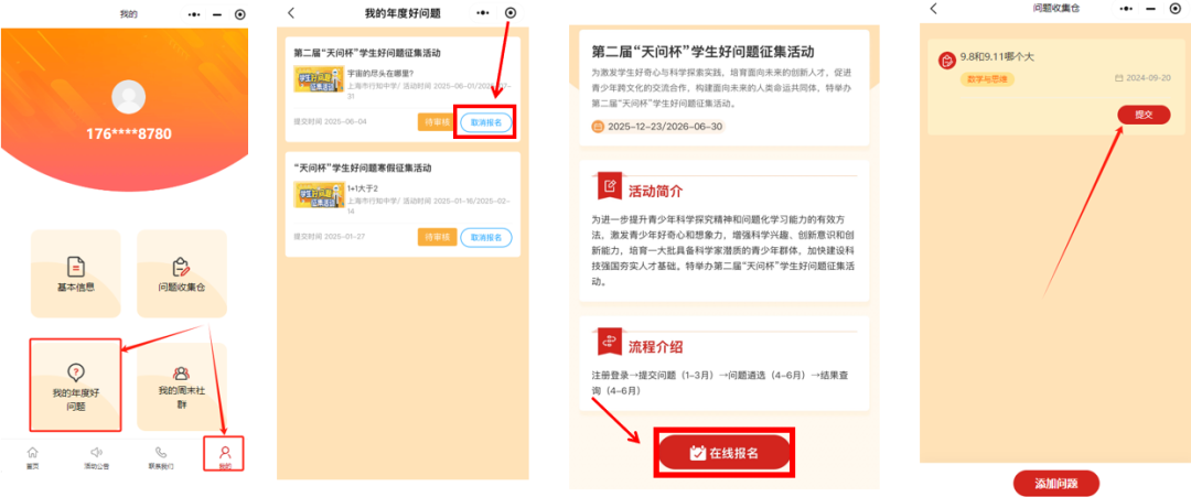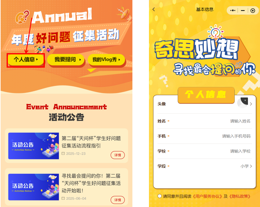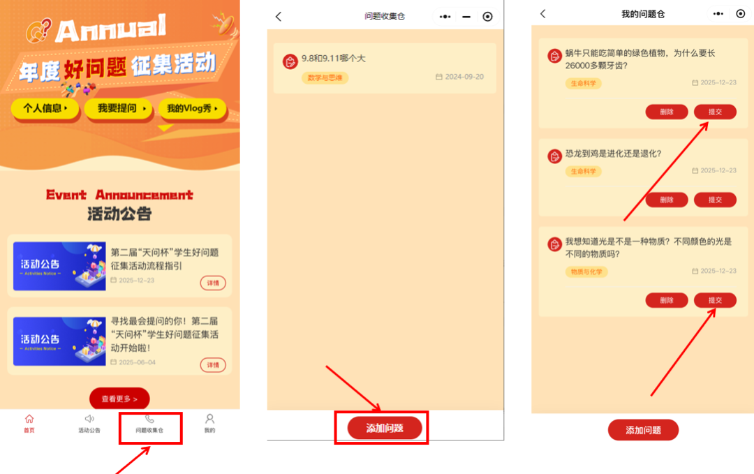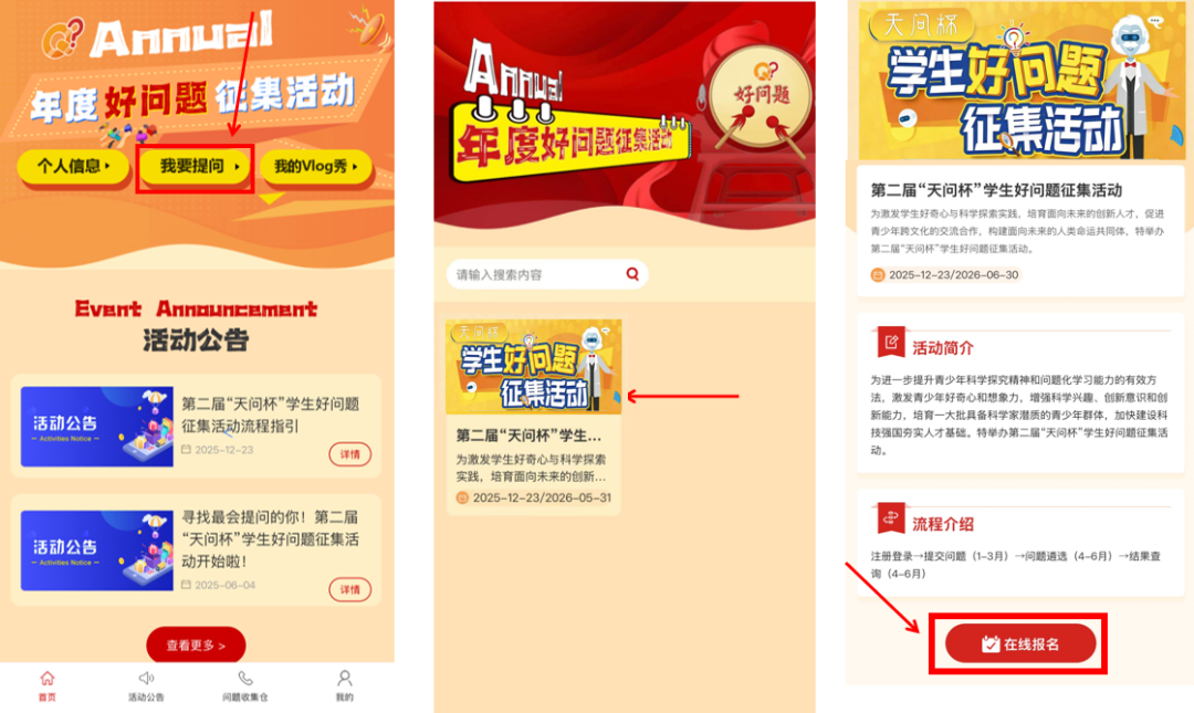 好奇心是孩子的天性 也是学习创造的原动力 一个好问题能有效激发出学生的 求知欲望和创新潜能 更是推动科技进步和社会发展的不竭动力 “天问杯”的命名灵感来源于 中国古代伟大的诗人 屈原的长诗《天问》 寓意鼓励学生 天天提问、天下共问、天马行空地问 首届“天问杯”学生好问题征集活动从上海启航,跨越江、浙、沪、皖、新疆等近10个省市及自治区,共收集了11万个富有创意和深度的好问题,已然成为培养拔尖创新人才的起点和孵化站,荣获中国基础教育十大创新实践案例。 第二届“天问杯”学生好问题征集活动在上海市教委、上海市科委、中科院上海分院和上海市宝山区人民政府指导下,由上海市科技艺术教育中心、上海市宝山区教育局、上海科普教育发展基金会联合举办,旨在激发学生好奇心和想象力,提升科学探究精神和问题化学习能力,加快培育一批具备科学家潜质的青少年群体,为科技强国建设筑牢人才基础。 活动主题 好问题——寻找最会提问的你 活动目标 培养学生问题意识、观察能力、创新思维和问题解决综合能力,全力打造培养杰出人才的起点和孵化站,同时有望显著促进国家创新能力的提升。 活动内容 好问题开放“问题征集”通道,设置小学、初中、高中(含中职)组别,聚焦“数学与思维”“生命科学”“物质与化学”“物理学”“天文学”“地球科学”“技术与工程”等,根据分类进行提问。 本届活动所有参与者均可获得活动参与证明,设“最具科学价值好问题”“最佳科学探究成果好问题”和“最受关注好问题”等若干奖项。 活动日程 活动分小学、初中、高中(含中职)三个学段组,分为初选、复选和决选展示三阶段赛程进行。“问题征集”申报时间截止至2026年3月31日。 初选→2026年4月 复选→2026年5月 决选展示→2026年6月 参与指南 扫描“学生好问题征集活动”微信小程序,进行注册并完善个人信息,即可参与活动。 学生可在哔哩哔哩网站“好问题”活动专题页(https://space.bilibili.com/3493262987889418)、宝山区青少年活动中心公众号进行在线学习。 流程指引 注册登录 ①扫描二维码或者微信搜索学生好问题征集活动小程序,进入活动页面 ②点击左上角个人信息,填报个人信息。 ①点击首页,我要提问,进入活动页面,点击第二届“天问杯”学生好问题征集活动。 ②点击在线报名,选择领域,输入问题内容,添加问题。 ③进行问题提交,每个人最多可提交5个问题。 ①问题收集仓可以对日常遇到的问题进行收集。 ②点击问题收集仓,进入个人问题收集仓。 ③点击添加问题,对问题进行收集添加。 ④选择问题进行提交,每个人最多可提交5个问题。 ①成功提交问题后,点击我的,可在我的年度好问题页面,看见已提交的问题。 ②点击取消报名,取消所有报名,并在问题收集仓中修改问题。 ③点击在线报名,重新报名提交,每个人最多可提交5个问题。 【免责声明】 1. 标注“来源”的内容版权归原权利人所有; 2. 原创内容转载须注明来源“”并附链接,禁止篡改/商用,未经允许不得转载; 3. 转载内容二次传播时必须标注原始出处,不得提及本账号为来源,其观点/准确性由原作者负责; 4. 使用互联网素材的,如涉版权异议,请及时联系我们处理。
