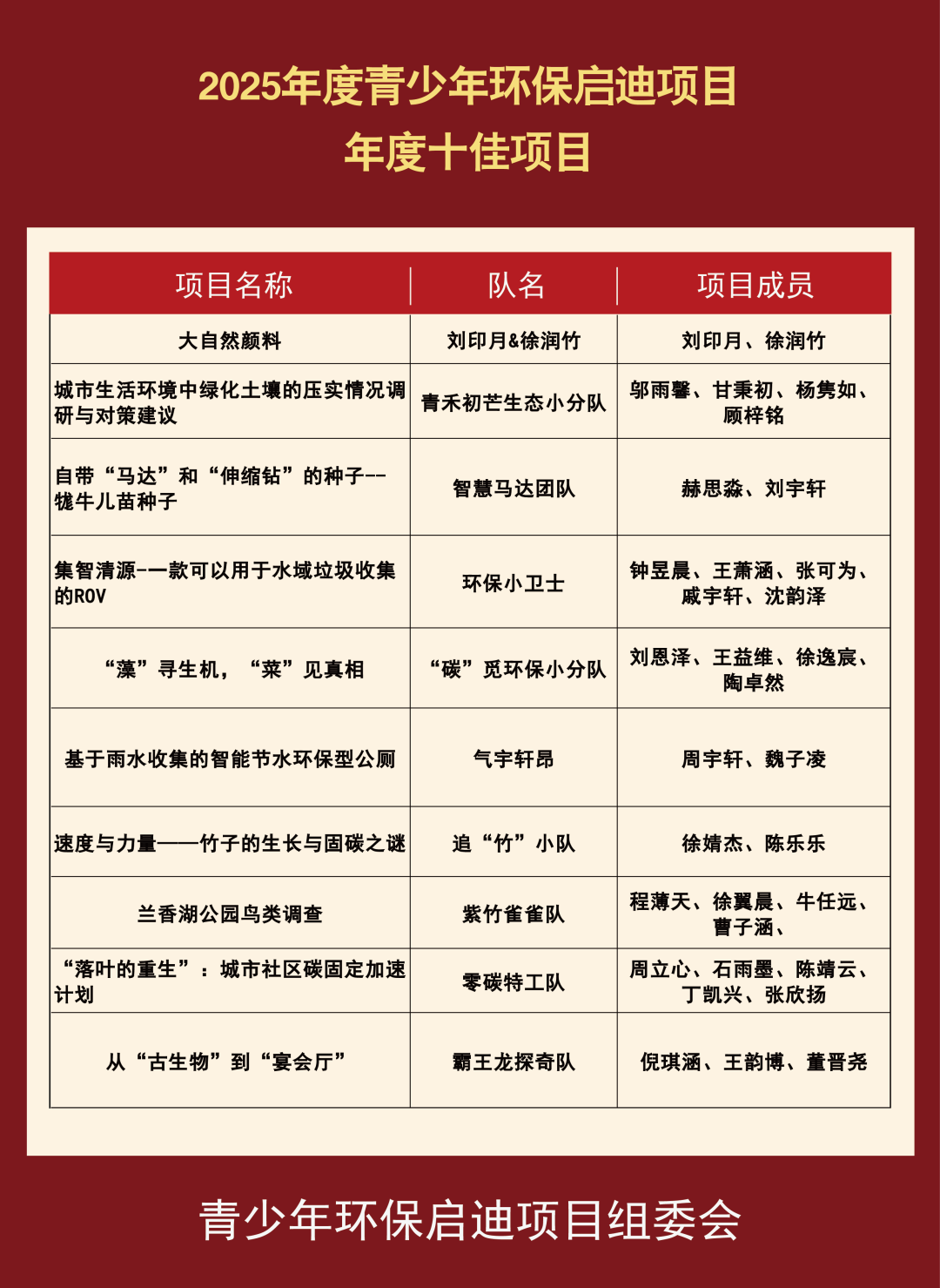2025年度青少年环保启迪项目年度十佳项目名单公布 青少年环保启迪项目组委会 【免责声明】 1. 标注“来源”的内容版权归原权利人所有; 2. 原创内容转载须注明来源“”并附链接,禁止篡改/商用,未经允许不得转载; 3. 转载内容二次传播时必须标注原始出处,不得提及本账号为来源,其观点/准确性由原作者负责; 4. 使用互联网素材的,如涉版权异议,请及时联系我们处理。