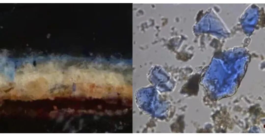 褪色是颜色逐渐变浅或消失的现象。褪色是由于颜料中的化学物质受到环境因素(如光线、热、湿度和污染物)的影响而被分解,导致颜色变淡。 变色是颜色逐渐改变的现象。变色可以是由于颜料中的化学物质受到环境因素的影响而变化,也可以是由于颜料中的不稳定成分在环境中发生化学反应导致的。这种情况下,原有颜色可能会变成不同的颜色,或者变成更加暗淡或更加明亮的颜色。 看过展览的小伙伴,可能注意到了尼古拉·普桑的《酒神的养育》,这幅画的画布已经磨损得很严重了,顶部被加了一条画布,明显经过了修复。证据显示,这幅名画已经产生了褪色变色,尤其是蓝色区域。专家们认为此处的蓝色色料很有可能是群青——一种昂贵的色料,以青金石为主要成分的矿物色料。