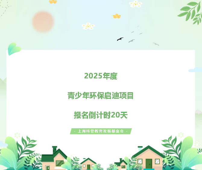 2025年度 青少年环保启迪项目 报名倒计时20天 最后20天!成为地球的青春守护者! 2025年度“青少年环保启迪项目”报名时间:2025.09.01-2025.10.31! 与伙伴们共创绿色方案,用行动点亮生态未来。你的每一个创意,都是改变世界的力量? 即刻报名,让这个秋天成为你环保征程的起点!点击链接(https://dsnxm.ssedf.org.cn/)跳转报名网站!