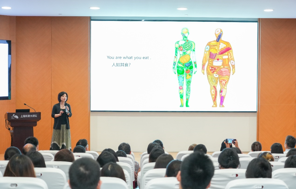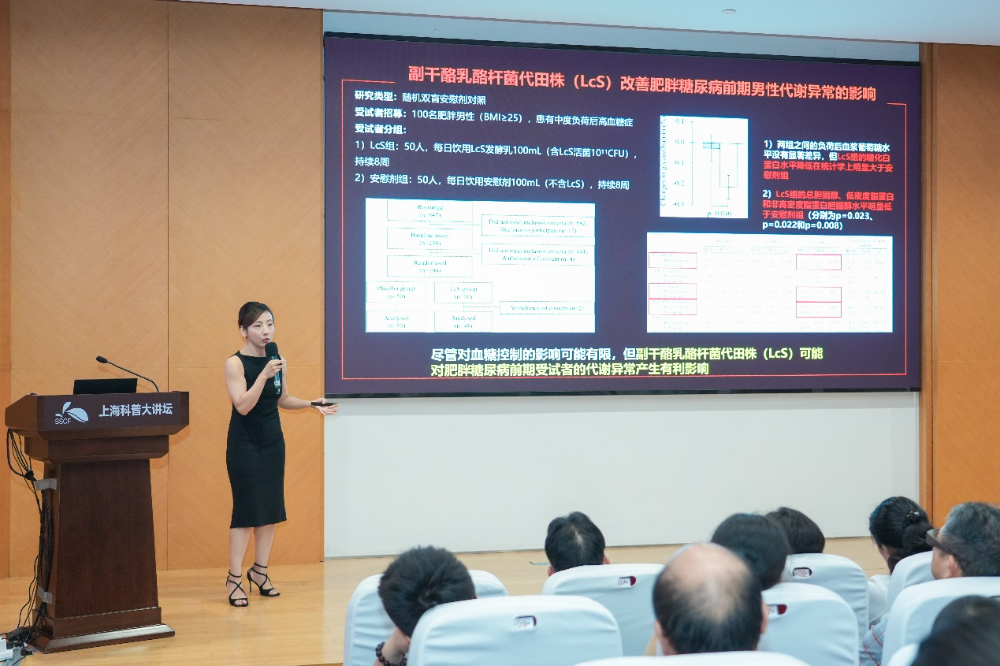 “营养健康,怎么吃?”吴江医生围绕这一跟每个人都密切相关的话题,科普肠道与营养的关系。 身体中营养的“旅行”即是新陈代谢的过程:首先通过饮食获得营养物质,再通过消化吸收将营养物质转变为自身需要的结构元件,进而通过合成与储存将结构元件装配成蛋白质、核酸、脂质等大分子,最终有机营养物质被分解,提供生命活动所需的一切能量。在此过程中,肠道是人体重要的消化吸收器官。同时,肠道也是免疫力的重要来源,肠道黏膜构成了强大的物理屏障,肠道菌群是维持免疫系统的基石。 基于不同营养素在免疫调节方面的作用,吴江医生还图文并茂地拆解了各类营养素的科学摄入量标准与参考范围,把复杂的知识变得具象化。 如何精准营养调控肠道菌群改善代谢?张晨虹研究员的讲座为人们答疑解惑。人体肠道内数以万亿计的微生物构成了精密的生态系统,兼具消化、营养合成、免疫调节及平衡代谢的作用,与肥胖、糖尿病等慢性病密切相关。肠道菌群从出生就开始建立,微生物以人们吃下的食物为原料进行着复杂的发酵工程。 张晨虹研究员介绍,通过调整饮食结构,特别是增加全谷物、蔬菜等富含膳食纤维的食物,可以有效优化菌群组成。更令人振奋的是,根据临床研究,维护肠道菌群平衡可能成为预防和治疗慢性疾病的新突破口。其中分享了一项副干酪乳酪杆菌代田株(LcS)开展肥胖糖尿病前期男性代谢异常的影响的研究,研究结果显示,LcS可能对肥胖糖尿病前期受试者的代谢异常产生有利影响。张晨虹带来《精准营养调控肠道菌群改善代谢》主题演讲